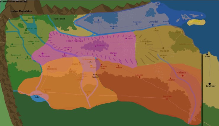 Among the many changes of this year’s timejump are big changes to the map. Falnorian has grown as explorers have ventured south into the rainforest, and many other features of the landscape have come and gone; new cities and towns have been built, and many nations have merged and their borders shifted. The new geographic (link) & political (link) maps are available on the Resources page, as well as below.
